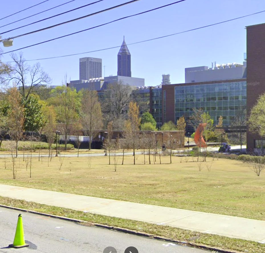 I thought about Melissa again when I saw Georgia Tech green space in the foreground with the Bank of America tower in the background. I pulled out my phone to take a picture but did not get it in time. This one from Google Maps approximates what I saw.